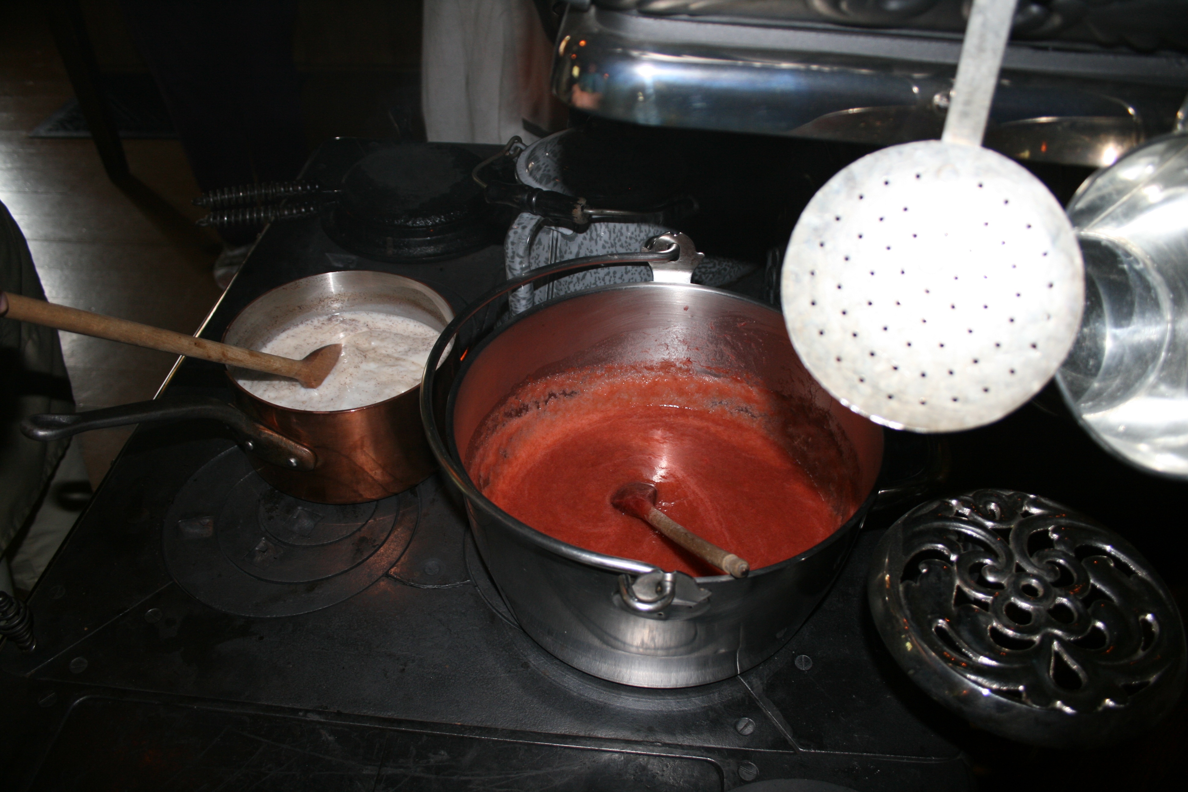 Arriving around 8:30AM, we were quickly divided into teams to take on various tasks. The breakfast menu changes with the seasons, and that June day’s menu included fresh strawberries, bacon fried with sweet peppers, rice waffles served with strawberry-rhubarb sauce, fried Mississippi catfish, a thin bread called Wisconsin cake, and coffee. Some teams worked in the steamy outdoor preserve kitchen, while the rest cooked in the main kitchen with its dim gas lighting and imposing, ornate cast iron wood stove.